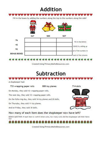 Christmas Math Worksheets - FMW Christmas math worksheets. Free Christmas math worksheets to engage your students at Christmas time. These are a fun way to review math topics or even as a reward. Christmas can be a challenging time to motivate your students, which is why you need to be crafty! These free math worksheets will keep your students occupied whilst doing maths! Christmas Maths Year 3 Activity Pack (teacher made) - Twinkl This pack of Christmas Maths Activities for Year 3 covers a variety of key topics including fractions, addition and subtraction, place value and multiplication and division. Each of the activities tests children's problem-solving skills by incorporating Maths calculations into Christmas-themed worded questions.